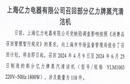 上海億力有限公司召回部分億力牌蒸汽清潔機